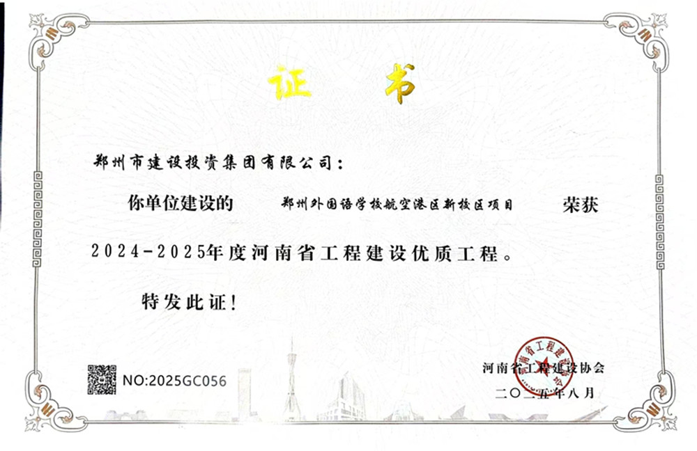 近日,由华体会体育(hth)官方网站 -在线娱乐入口- HTH SPORTS 代建的郑州外国语学校航空港区新校区项目荣获2024-2025年度河南省工程建设优质工程荣誉。